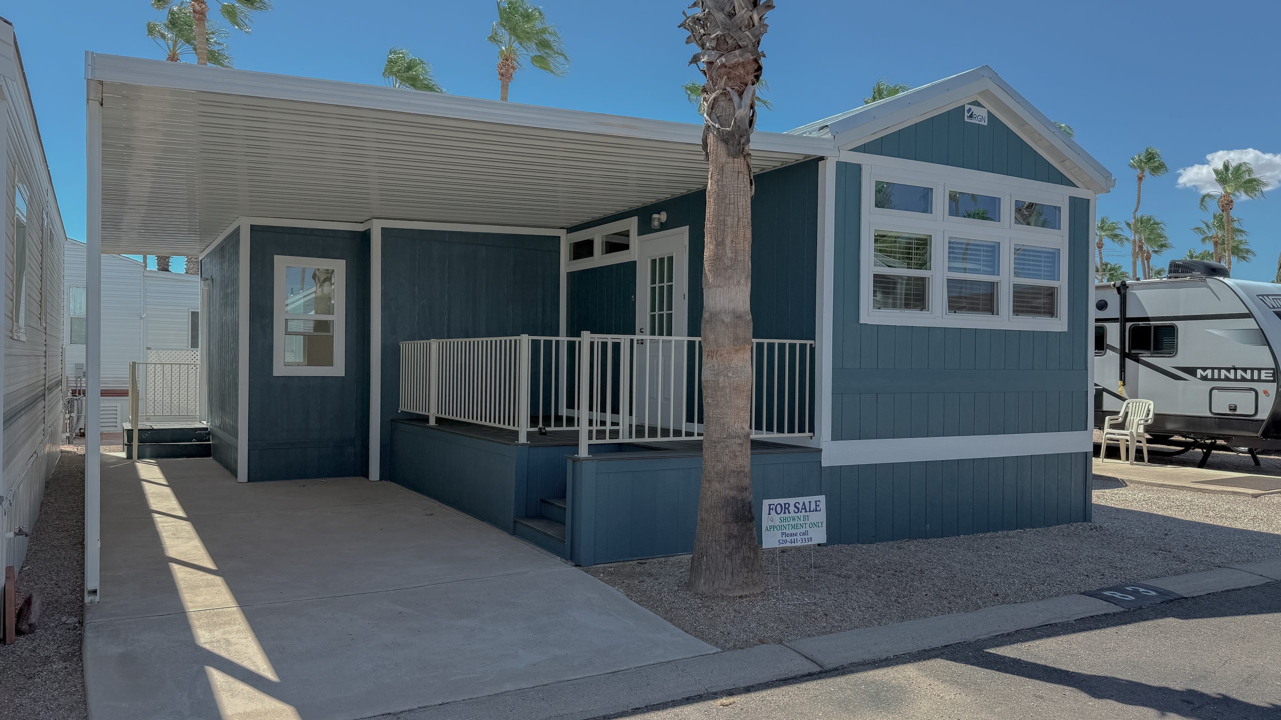 Brand new 2023 RGN park model featuring open kitchen with white cabinets and black appliance package including dishwasher. The faux marble countertops add richness to the kitchen and bath, and you will love the energy efficient mini split heating and cooling. The barn door leads to cozy bedroom and the bathroom has a step-in shower. The cool blues and grey décor make for a welcoming, relaxing stay! New Arizona Room!