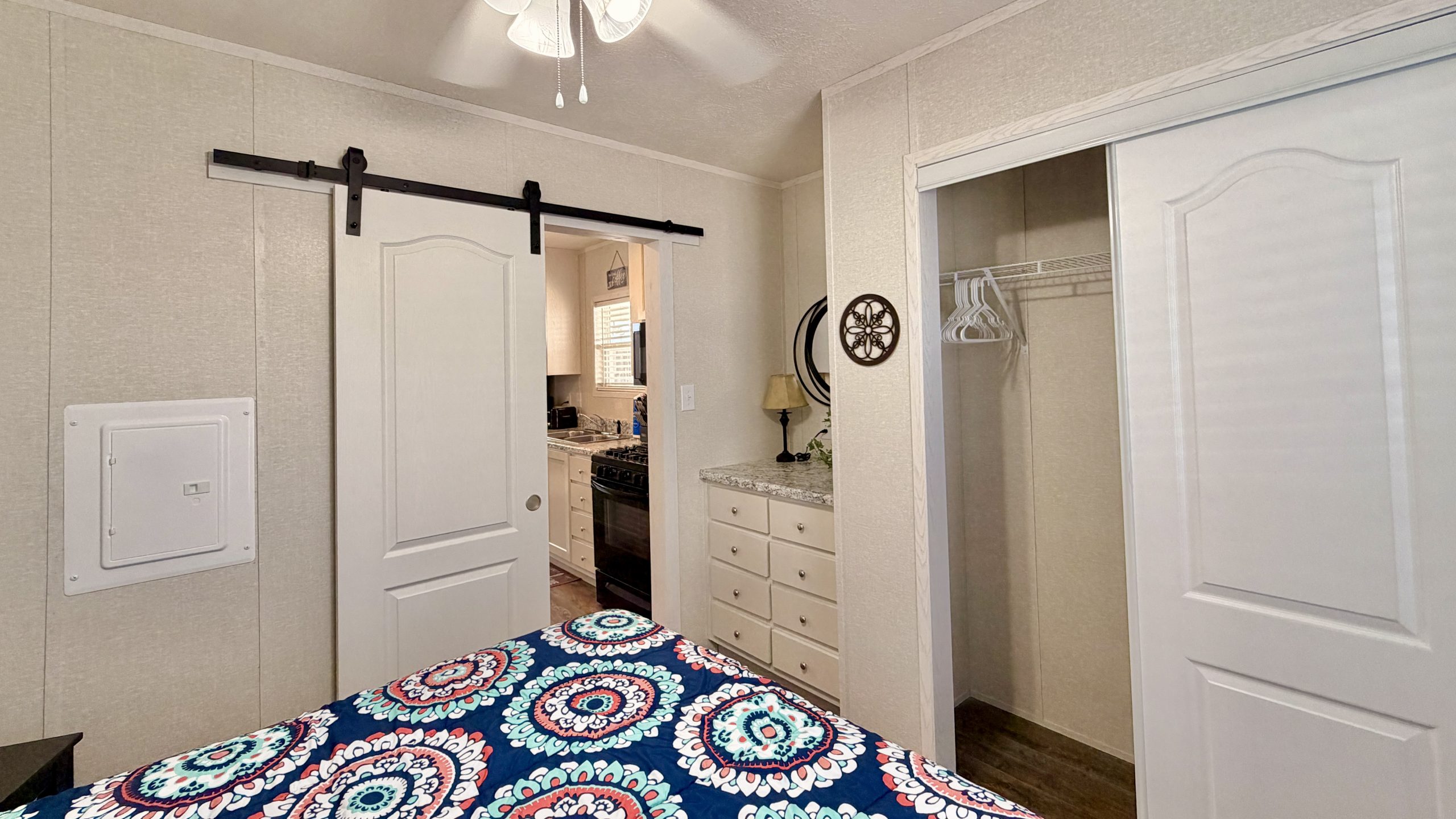 Beautiful brand new 2023 park model featuring galley style kitchen with white cabinets offset by black appliances including a dishwasher. You will love energy efficient mini-split heating/cooling system and the easy step-in shower. The cozy bedroom has built in drawers as well as 2 closets and a sliding barn door.