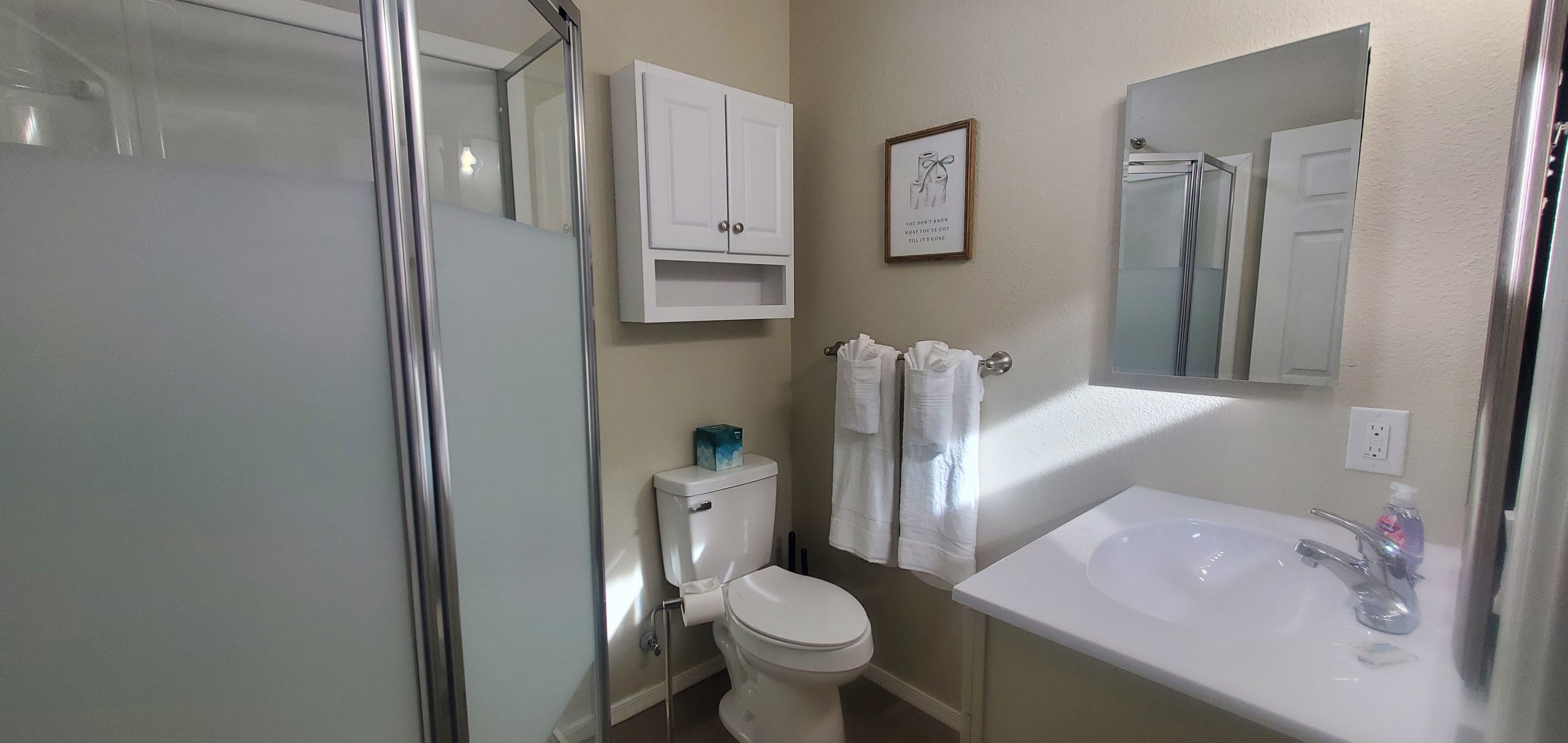 The roomy bathroom showcases a stylish round shower, adding both function and flair. Throughout the home, vaulted ceilings, ceiling fans, and recessed lighting enhance the open feel while delivering modern comfort and efficient cooling.