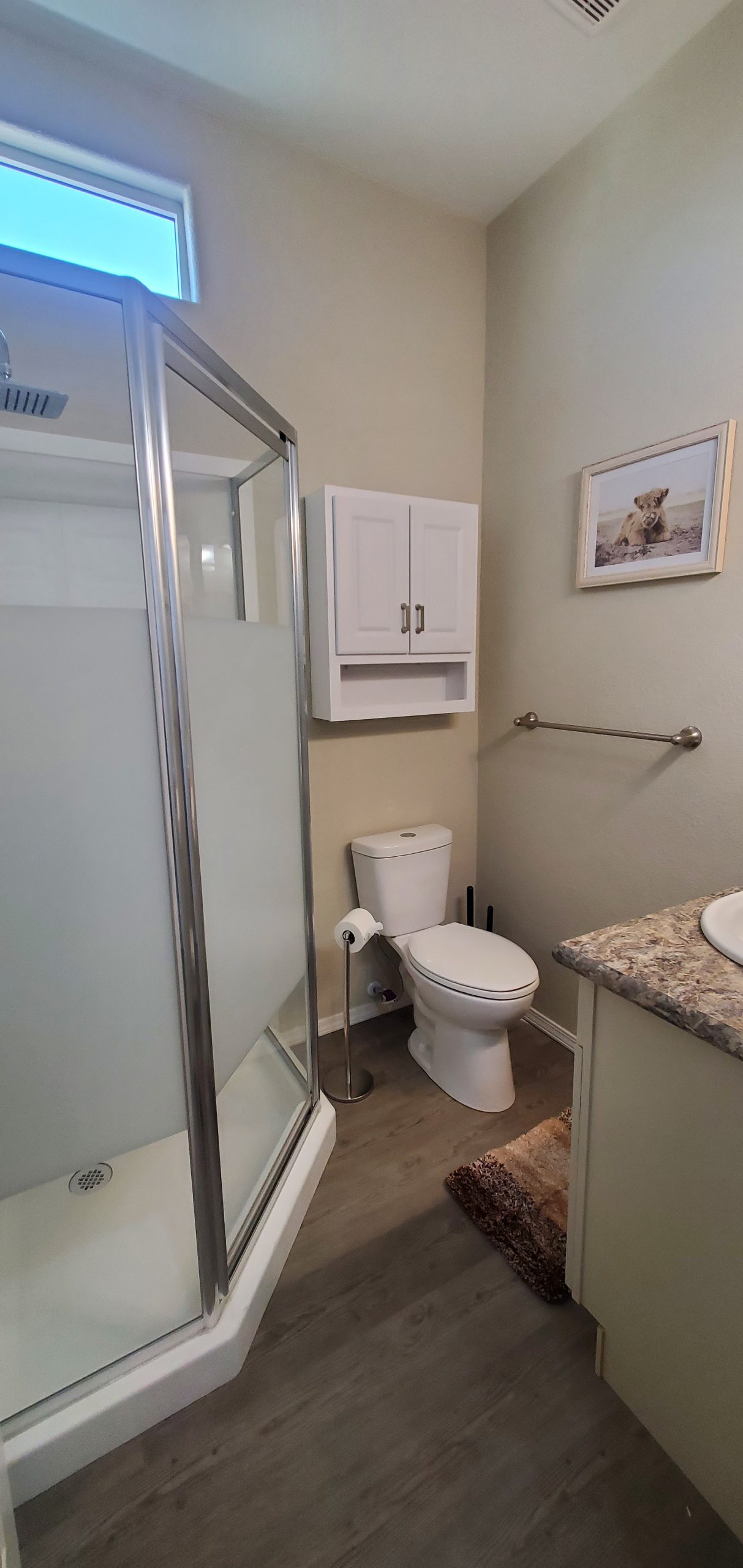 The roomy bathroom showcases a stylish round shower, adding both function and flair. Throughout the home, vaulted ceilings, ceiling fans, and recessed lighting enhance the open feel while delivering modern comfort and efficient cooling.
