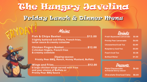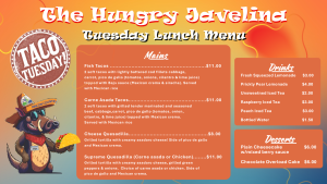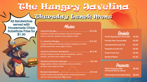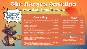 Craving something delicious? The Hungry Javelina is here to satisfy your appetite with bold flavors and fresh, made-to-order meals. Located at Rincon Country West next to the poolside courtyard, the Hungry Javelina serves up a rotating menu that changes daily—so there’s plenty of options to satisfy your cravings!